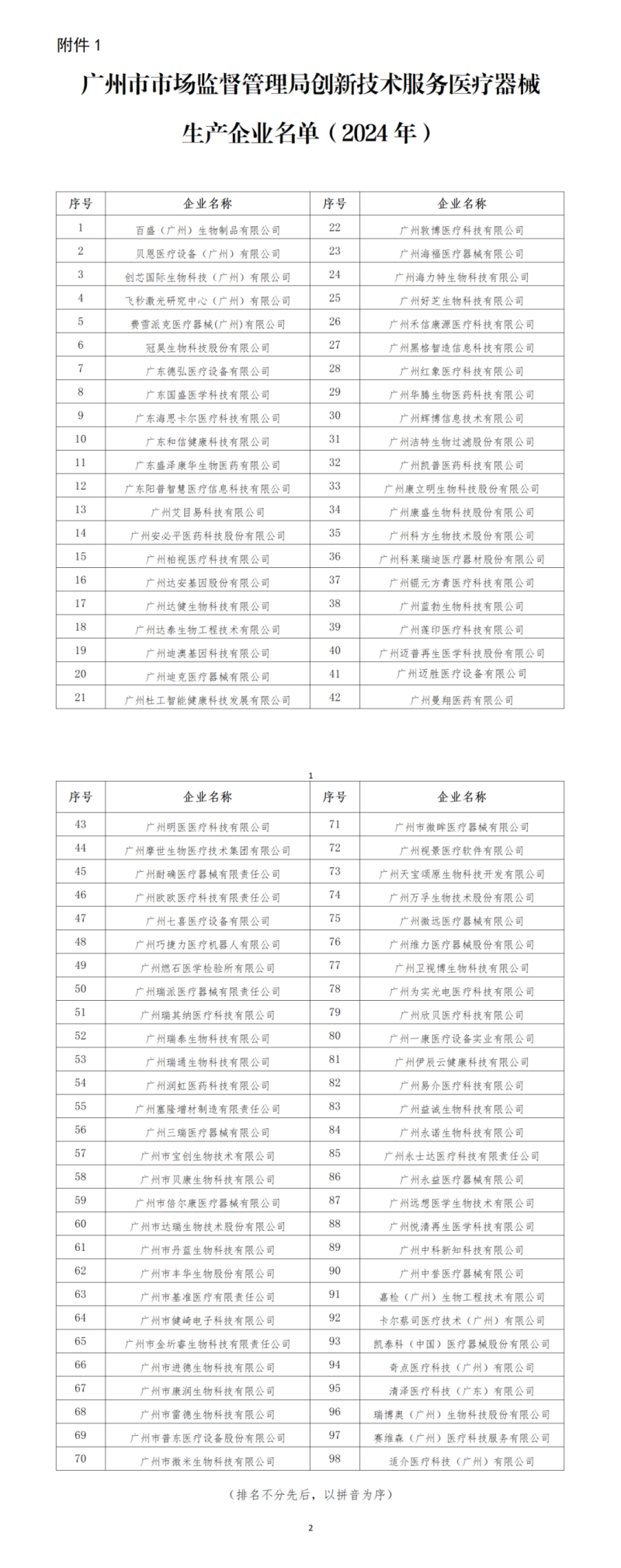 經(jīng)前期遴選,納入《廣州市市場監(jiān)督管理局創(chuàng)新技術(shù)服務(wù)醫(yī)療器械生產(chǎn)企業(yè)名單(2024年)》的企業(yè)(簡稱《名單》,見下方附件圖片),共包括廣州紅象醫(yī)療科技有限公司、廣州科萊瑞迪醫(yī)療器材股份有限公司、廣州黑格智造信息科技有限公司等98家企業(yè),原則上每家企業(yè)自主選擇不多于三個擬注冊單元。
