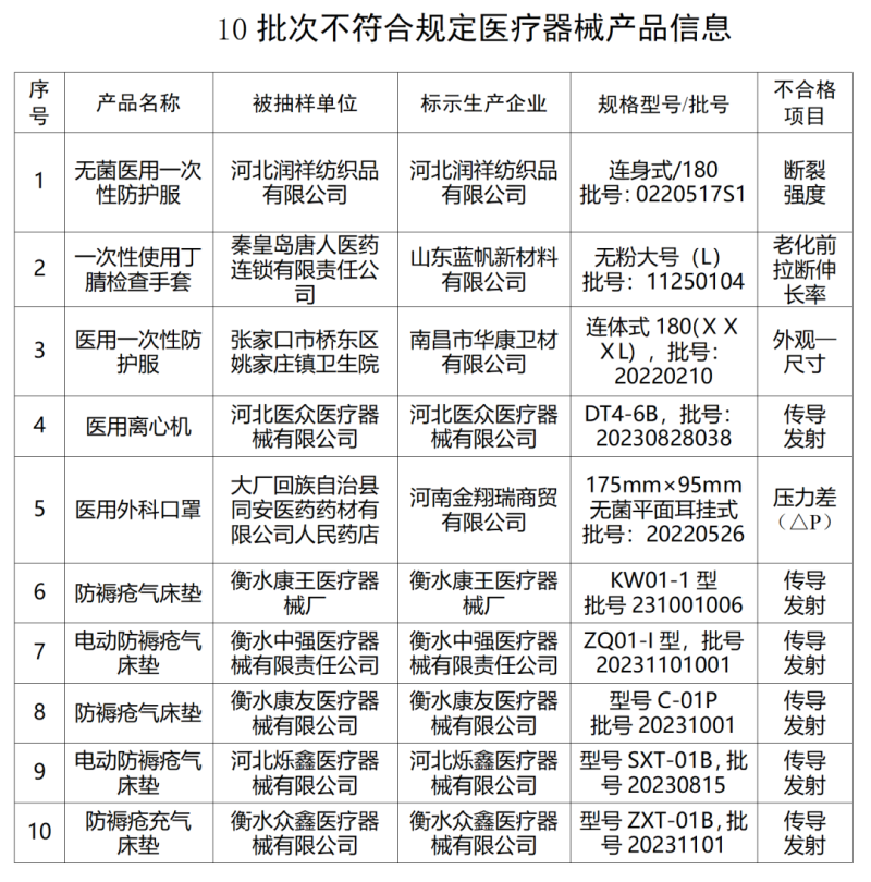 為加強(qiáng)醫(yī)療器械質(zhì)量監(jiān)督管理,保障醫(yī)療器械質(zhì)量安全有效,按照《醫(yī)療器械監(jiān)督管理?xiàng)l例》及《河北省醫(yī)療器械監(jiān)督抽驗(yàn)管理辦法》有關(guān)規(guī)定,河北省藥品監(jiān)督管理局組織對(duì)2023年全省生產(chǎn)、經(jīng)營(yíng)和使用等環(huán)節(jié)醫(yī)療器械進(jìn)行了質(zhì)量監(jiān)督抽檢,發(fā)現(xiàn)10批次產(chǎn)品不符合標(biāo)準(zhǔn)規(guī)定,并已依法分別予以查處,現(xiàn)予以公開(kāi)。