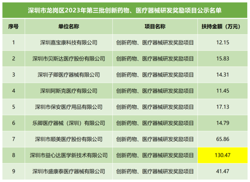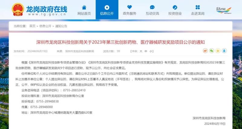 6月19日,深圳市龍崗區(qū)科技創(chuàng)新局對(duì)外公示了9個(gè)2023年第三批創(chuàng)新藥物、醫(yī)療器械研發(fā)獎(jiǎng)勵(lì)項(xiàng)目,最高擬資助130.47萬(wàn)元,具體明細(xì)如下: