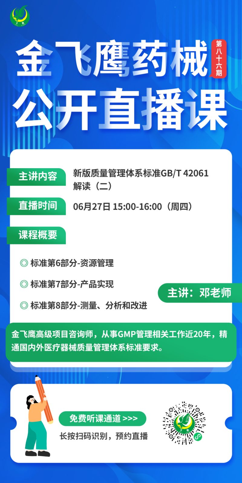 6月27日下午3點,金飛鷹高級項目咨詢師,從事GMP管理相關(guān)工作近20年,精通國內(nèi)外醫(yī)療器械質(zhì)量管理體系標(biāo)準(zhǔn)要求的鄧?yán)蠋?/span>,給大家?guī)怼缎掳驷t(yī)療器械質(zhì)量管理體系標(biāo)準(zhǔn)GB/T 42061解讀(二)》,培訓(xùn)內(nèi)容是標(biāo)準(zhǔn)的第6-8部分(資源管理、產(chǎn)品實現(xiàn)、測量/分析和改進(jìn))解讀,大家千萬不要錯過了哦!