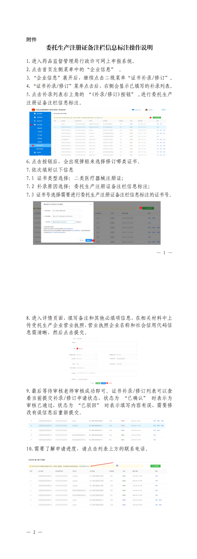 一、自2024年6月1日起,涉及境內(nèi)委托生產(chǎn)的注冊(cè)申請(qǐng)或者延續(xù)注冊(cè)申請(qǐng),省局將在醫(yī)療器械注冊(cè)證生產(chǎn)地址欄中登載受托生產(chǎn)地址并注明“(委托生產(chǎn))”,同時(shí)在備注欄備注受托生產(chǎn)企業(yè)名稱和統(tǒng)一社會(huì)信用代碼,備注形式為“受托生產(chǎn)企業(yè):XXXX公司;統(tǒng)一社會(huì)信用代碼:XXXX”。變更注冊(cè)涉及注冊(cè)人委托生產(chǎn)的,也將在變更注冊(cè)文件中按照上述方式注明委托生產(chǎn)相關(guān)信息,并將變更信息在注冊(cè)證書生產(chǎn)地址和備注相應(yīng)字段中更新。 二、僅受托生產(chǎn)企業(yè)名稱文字性變化的,無需申請(qǐng)變更備案,在延續(xù)注冊(cè)時(shí),核發(fā)修改后的注冊(cè)證。 三、對(duì)省內(nèi)已核發(fā)的涉及境內(nèi)委托生產(chǎn)的注冊(cè)證,若未按照上述要求標(biāo)注相關(guān)信息,注冊(cè)人可按照附件操作說明申請(qǐng)標(biāo)注,相關(guān)工作應(yīng)在8月31日前完成。 四、注冊(cè)人不再進(jìn)行委托生產(chǎn)的,應(yīng)當(dāng)及時(shí)向省局核減受托生產(chǎn)地址;受托生產(chǎn)企業(yè)應(yīng)當(dāng)及時(shí)向所在地省級(jí)藥品監(jiān)督管理部門報(bào)告有關(guān)情況。 五、注冊(cè)人在申請(qǐng)標(biāo)注過程中存在疑問的,可與省局相關(guān)部門聯(lián)系。醫(yī)療器械注冊(cè)管理處,0791-88158031;系統(tǒng)運(yùn)維工程師,0791-88125223(吳工)、0791-86507350(涂工)。