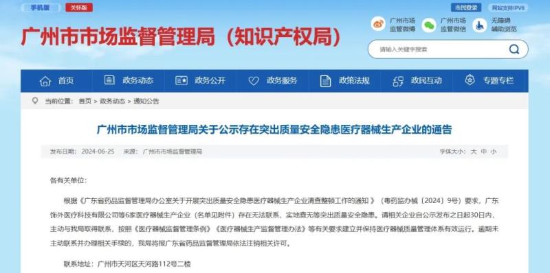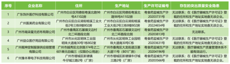 近日,廣州市市場(chǎng)監(jiān)督管理局發(fā)布《關(guān)于公示存在突出質(zhì)量安全隱患醫(yī)療器械生產(chǎn)企業(yè)的通告》,其中指出,廣東飾外醫(yī)療科技有限公司、廣州醫(yī)美藥業(yè)有限公司等6家醫(yī)療器械生產(chǎn)企業(yè)存在存在無(wú)法聯(lián)系、實(shí)地查無(wú)等突出質(zhì)量安全隱患,具體名單如下: