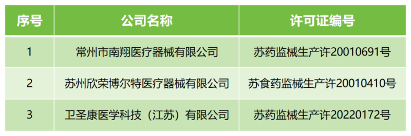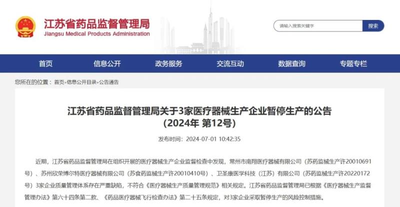 江蘇省藥品監(jiān)督管理局已根據(jù)《醫(yī)療器械生產(chǎn)監(jiān)督管理辦法》第六十四條第二款、《藥品醫(yī)療器械飛行檢查辦法》第二十五條規(guī)定,對3家企業(yè)采取暫停生產(chǎn)的風(fēng)險(xiǎn)控制措施。