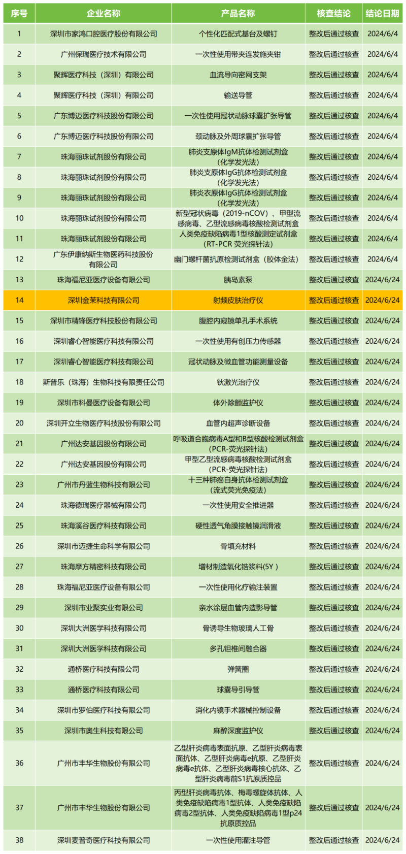 7月16日,廣東省藥監(jiān)局官網(wǎng)公布2024年6月醫(yī)療器械注冊(cè)質(zhì)量管理體系核查結(jié)果,包括深圳市家鴻口腔醫(yī)療股份有限公司的個(gè)性化匹配式基臺(tái)及螺釘、珠海福尼亞醫(yī)療設(shè)備有限公司的胰島素泵、深圳金茉科技有限公司的射頻皮膚治療儀等共計(jì)38款產(chǎn)品,均為“整改后通過(guò)核查”。具體明細(xì)見下方表格:
