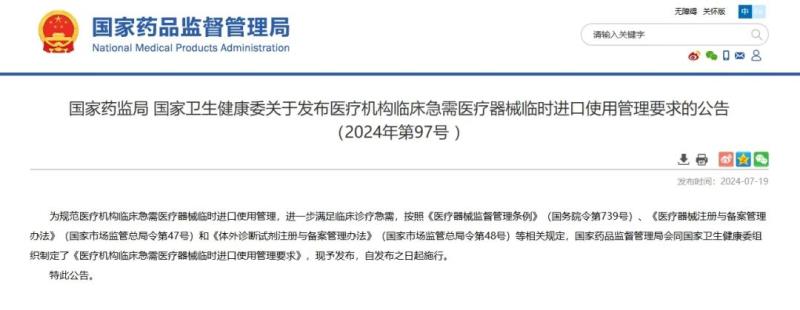 7月19日,國家藥監(jiān)局《醫(yī)療機構(gòu)臨床急需醫(yī)療器械臨時進口使用管理要求》(以下簡稱《管理要求》),并宣布自發(fā)布之日起施行。