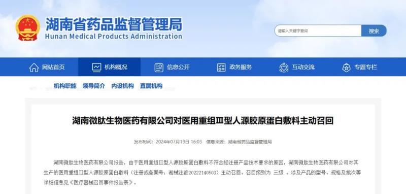 近日,湖南省藥監(jiān)局發(fā)布公告稱,據(jù)湖南微肽生物醫(yī)藥有限公司報告,由于醫(yī)用重組Ⅲ型人源膠原蛋白敷料不符合經(jīng)注冊產(chǎn)品技術(shù)要求(具體情況:經(jīng)廣東省醫(yī)療器械抽檢,該批號產(chǎn)品裝量標示規(guī)格3ml,實際檢測結(jié)果3.5ml),湖南微肽生物醫(yī)藥有限公司對其生產(chǎn)的醫(yī)用重組Ⅲ型人源膠原蛋白敷料(注冊證編號:湘械注準20222140503)主動召回。召回級別為三級。