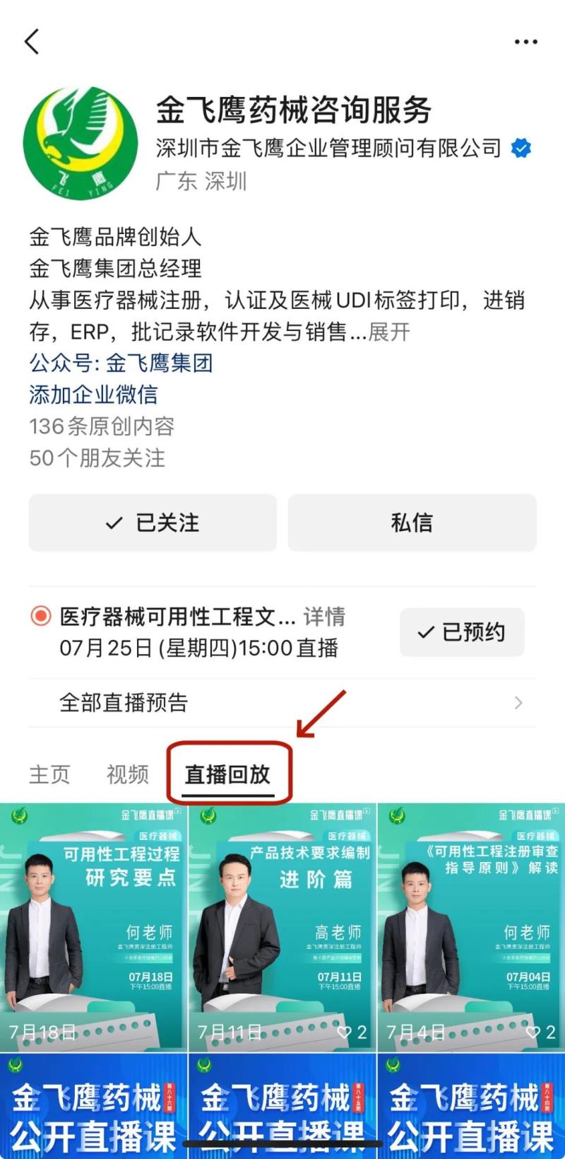 往期直播培訓課程支持回放,關(guān)注“金飛鷹藥械咨詢服務(wù)”視頻號并點擊視頻號主頁,即可查看“直播回放”哦~