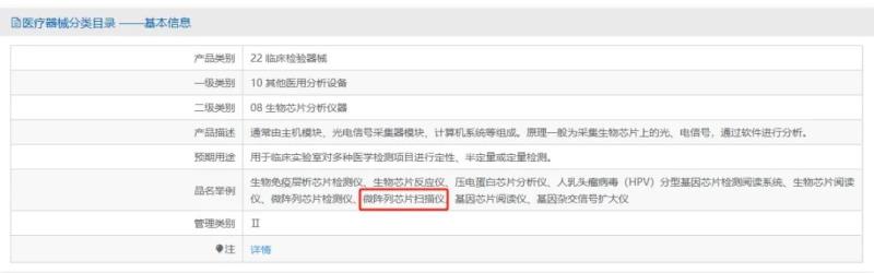 微陣列芯片掃描儀,其產(chǎn)品描述為“通常由主機(jī)模塊、光電信號(hào)采集器模塊、計(jì)算機(jī)系統(tǒng)等組成。原理一般為采集生物芯片上的光、電信號(hào),通過(guò)軟件進(jìn)行分析”;預(yù)期用途是“用于臨床實(shí)驗(yàn)室對(duì)多種醫(yī)學(xué)檢測(cè)項(xiàng)目進(jìn)行定性、半定量或定量檢測(cè)”,此類產(chǎn)品在我國(guó)作為第二類醫(yī)療器械管理,分類編碼22-10-08。