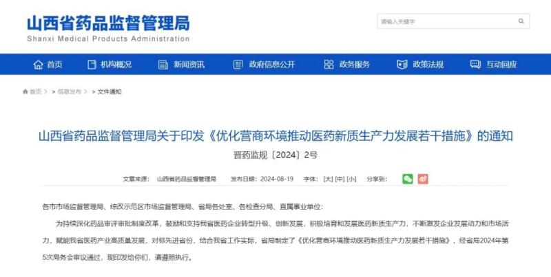 8月19日,山西省藥監(jiān)局發(fā)布《優(yōu)化營商環(huán)境推動醫(yī)藥新質(zhì)生產(chǎn)力發(fā)展若干措施》(以下簡稱《若干措施》),并宣布自2024年8月1日起施行,有效期至2029年7月31日。