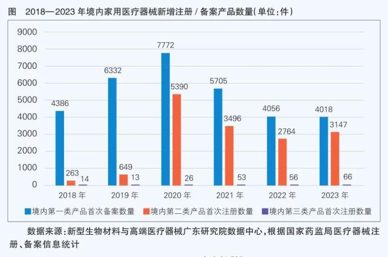 本文轉(zhuǎn)載自中國醫(yī)藥報(bào) 作者:張梓敏?況宇迪?郝麗靜 隨著心血管疾病、糖尿病等慢性疾病患病率上升和人口老齡化發(fā)展,慢性疾病監(jiān)控和日常健康管理需求不斷增加;監(jiān)測(cè)與診療場景也逐步從醫(yī)院端延伸向家庭端,帶動(dòng)了家用醫(yī)療器械市場的快速發(fā)展。此外,即時(shí)檢測(cè)(POCT)與智能化技術(shù)的發(fā)展也不斷推動(dòng)傳統(tǒng)家用醫(yī)療器械升級(jí)創(chuàng)新。目前,我國家用醫(yī)療器械市場呈現(xiàn)產(chǎn)業(yè)集聚、產(chǎn)品多元的發(fā)展態(tài)勢(shì)。 國產(chǎn)產(chǎn)品居多 以第一類和第二類醫(yī)療器械為主 根據(jù)美國食品藥品管理局(FDA)指導(dǎo)文件的定義,家用醫(yī)療器械主要是指標(biāo)明為在專業(yè)醫(yī)療場所之外的任何環(huán)境中使用的醫(yī)療器械。基于上述定義和2023年國家藥監(jiān)局發(fā)布的新版《醫(yī)療器械分類目錄》,家用醫(yī)療器械在我國涉及“醫(yī)用診察和監(jiān)護(hù)器械”“呼吸、麻醉和急救器械”“物理治療器械”“注輸、護(hù)理和防護(hù)器械”“患者承載器械”“眼科器械”“婦產(chǎn)科、輔助生殖和避孕器械”“醫(yī)用康復(fù)器械”“中醫(yī)器械”“臨床檢驗(yàn)器械”“體外診斷試劑”11個(gè)產(chǎn)品大類。 按照使用功能分類,家用醫(yī)療器械可分為治療類,如遠(yuǎn)紅外線治療儀、磁療儀、理療儀、中頻治療儀等;檢測(cè)類,如血壓檢測(cè)儀、血糖檢測(cè)儀、電子體溫計(jì)、聽診器等;康復(fù)類,如家用制氧機(jī)、頸椎腰椎牽引器、矯形器等。 根據(jù)國家藥監(jiān)局醫(yī)療器械注冊(cè)、備案信息統(tǒng)計(jì)(下同)顯示,截至今年7月,我國已注冊(cè)/備案家用醫(yī)療器械產(chǎn)品共計(jì)66336件,其中進(jìn)口產(chǎn)品1605件、國產(chǎn)產(chǎn)品64731件。從產(chǎn)品分類上看,第三類醫(yī)療器械1168件、第二類醫(yī)療器械22602件、第一類醫(yī)療器械42566件;涉及的11類醫(yī)療器械分類目錄產(chǎn)品中,最多的是注輸、護(hù)理和防護(hù)器械,共計(jì)29795件,占比44.92%;其次是物理治療器械、醫(yī)用康復(fù)器械,分別為18885件(28.47%)、7709件(11.62%)。從使用功能方面看,主要為康復(fù)類器械及治療類器械。 統(tǒng)計(jì)數(shù)據(jù)顯示,境內(nèi)家用醫(yī)療器械新增注冊(cè)及備案數(shù)量在2019年和2020年均有較大提升,2021年開始有所回落,2023年相較于2022年又出現(xiàn)小幅增長。其中,2020年受新冠疫情影響,家用醫(yī)療器械產(chǎn)品需求快速增長,境內(nèi)第二類家用醫(yī)療器械產(chǎn)品首次注冊(cè)數(shù)量大幅增長,達(dá)到5390件,同比增長730.5%。(詳見圖)