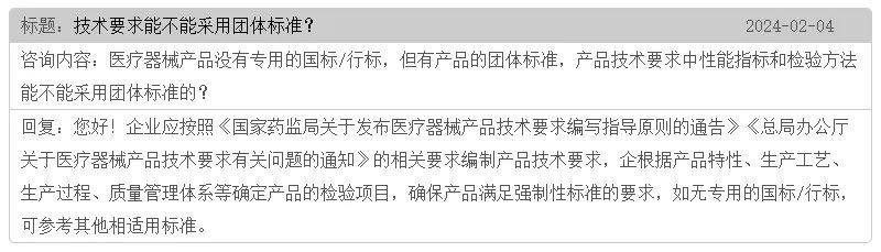 根據(jù)國家藥監(jiān)局食品藥品審核查驗中心的答復(fù),企業(yè)應(yīng)按照《國家藥監(jiān)局關(guān)于發(fā)布醫(yī)療器械產(chǎn)品技術(shù)要求編寫指導(dǎo)原則的通告》《總局辦公廳關(guān)于醫(yī)療器械產(chǎn)品技術(shù)要求有關(guān)問題的通知》的相關(guān)要求編制產(chǎn)品技術(shù)要求,根據(jù)產(chǎn)品特性、生產(chǎn)工藝、生產(chǎn)過程、質(zhì)量管理體系等確定產(chǎn)品的檢驗項目,確保產(chǎn)品滿足強制性標(biāo)準(zhǔn)的要求,如無專用的國標(biāo)/行標(biāo),可參考其他相適用標(biāo)準(zhǔn)。