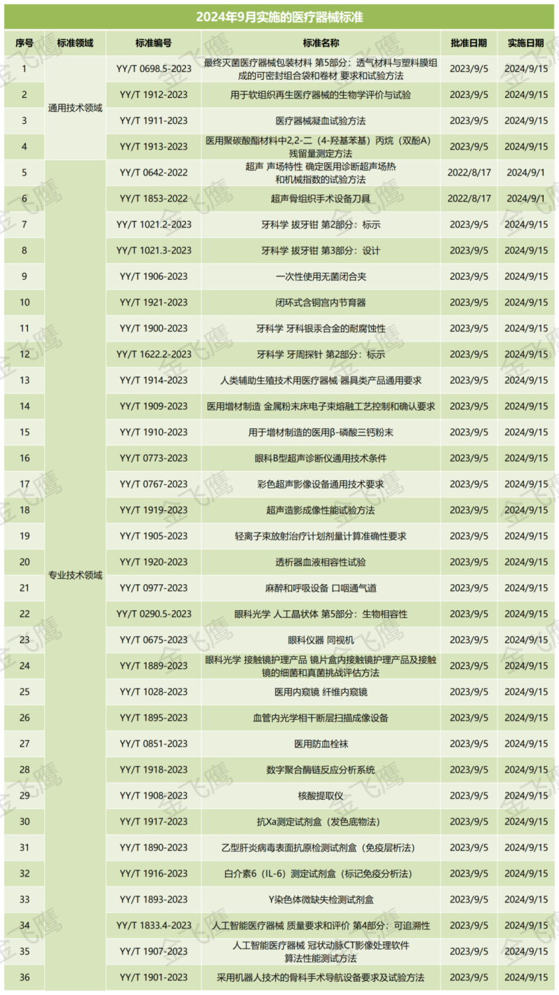 8月最后一個(gè)工作日,按照咱們的老規(guī)矩,在某月有較多醫(yī)療器械標(biāo)準(zhǔn)實(shí)施的情況下,我們都會(huì)匯總整理分享給大家,那么本期文章我們就給大家盤點(diǎn)一下2024年9月起即將實(shí)施的36項(xiàng)醫(yī)療器械標(biāo)準(zhǔn),這其中有自2024年9月1日起實(shí)施的,也有自2024年9月15日起實(shí)施的,如YY/T 0698.5-2023《最終滅菌醫(yī)療器械包裝材料 第5部分:透氣材料與塑料膜組成的可密封組合袋和卷材 要求和試驗(yàn)方法》、YY/T 0767-2023《彩色超聲影像設(shè)備通用技術(shù)要求》等,具體清單如下: