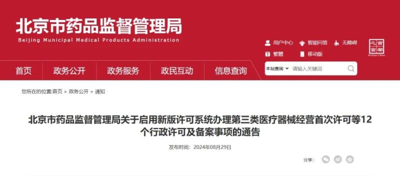 8月29日,北京市藥監(jiān)局發(fā)布通告稱,自2024年9月1日起,第三類醫(yī)療器械經(jīng)營首次許可、第一類醫(yī)療器械生產(chǎn)備案新辦等12個行政許可及備案事項(詳見下方表格)使用新版許可系統(tǒng)辦理。上述事項的原申報入口同步關(guān)閉。