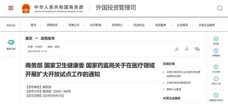 9月8日,商務部、國家衛(wèi)生健康委、國家藥監(jiān)局聯(lián)合發(fā)布《關于在醫(yī)療領域開展擴大開放試點工作的通知》,以擴大開放促進我國醫(yī)療相關領域高質量發(fā)展,更好滿足人民群眾醫(yī)療健康需求。以下為該通知具體內容: