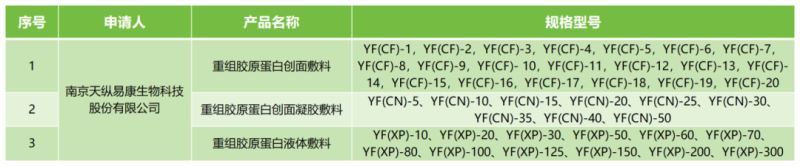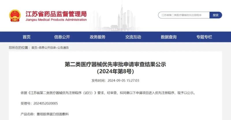 近日,江蘇省藥監(jiān)局發(fā)布《第二類醫(yī)療器械優(yōu)先審批申請(qǐng)審查結(jié)果公示(2024年第8號(hào))》,共有3款重組膠原蛋白敷料產(chǎn)品,具體如下: