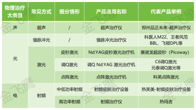 對醫(yī)療器械行業(yè)稍有了解的朋友應該都聽過“聲光電”,這是幾種物理治療方式的簡稱,它們在醫(yī)美產(chǎn)品領域的應用極為廣泛。這里的“聲”指的是超聲;“光”的形式則有多種,如激光、強脈沖光、紅藍光、紫光等,而就激光來說,又分為皮秒激光、調(diào)Q激光、點陣激光等,強脈沖光常見代表性產(chǎn)品則有M22、BBL、王者風范等;電學類產(chǎn)品最常見的則是熱瑪吉,主要利用電能作用于人體組織產(chǎn)生熱效應,以實現(xiàn)減輕皮膚皺紋等作用。