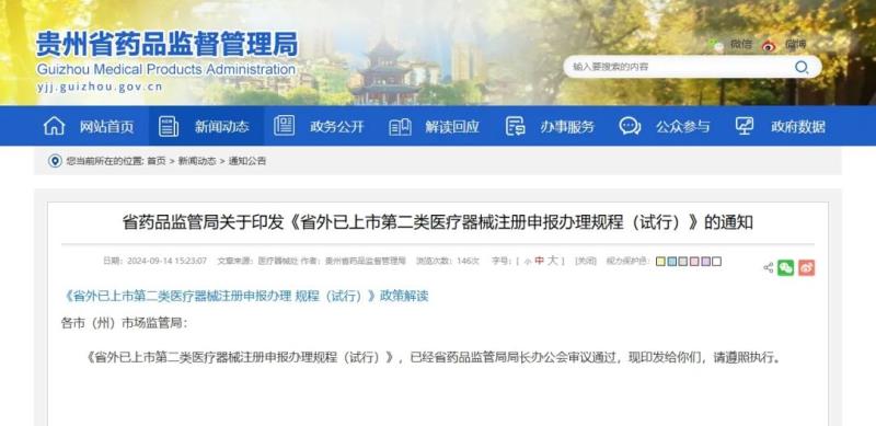 近日,貴州省藥監(jiān)局官網(wǎng)發(fā)布《省外已上市第二類醫(yī)療器械注冊申報(bào)辦理規(guī)程(試行)》,具體內(nèi)容如下: