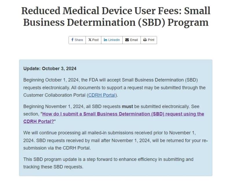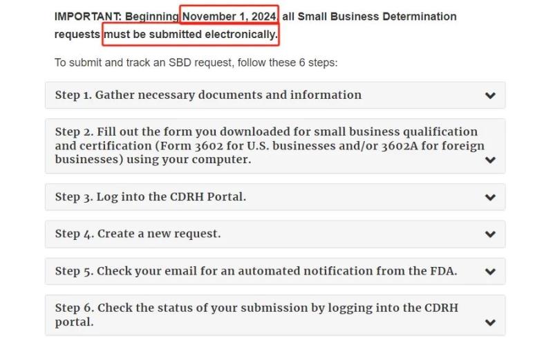 公告提到,從2024年10月1日開始,F(xiàn)DA將接受電子形式的小企業(yè)認(rèn)定(SBD)請(qǐng)求。支持請(qǐng)求的所有文件都可以通過Customer Collaboration Portal(CDRH Portal) 提交。
