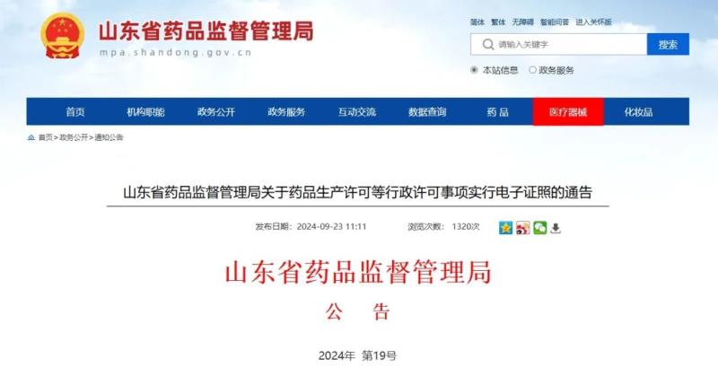 近日,山東省藥監(jiān)局發(fā)布《關(guān)于藥品生產(chǎn)許可等行政許可事項(xiàng)實(shí)行電子證照的通告》,其中提到,自2024年10月1日起,該局受理的藥品生產(chǎn)許可、藥品經(jīng)營(yíng)許可(批發(fā))、醫(yī)療機(jī)構(gòu)配制制劑許可、醫(yī)療器械生產(chǎn)許可、化妝品生產(chǎn)許可、醫(yī)療單位使用放射性藥品許可、藥品醫(yī)療器械互聯(lián)網(wǎng)信息服務(wù)審批共7個(gè)事項(xiàng)(含核發(fā)、變更、延續(xù)、換發(fā)),實(shí)行電子證照。