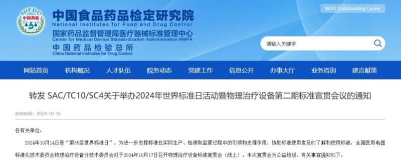 10月16日,中檢院官網(wǎng)轉(zhuǎn)發(fā)了一則標(biāo)準(zhǔn)宣貫會議通知,其中提到,全國醫(yī)用電器標(biāo)準(zhǔn)化技術(shù)委員會物理治療設(shè)備分技術(shù)委員會定于10月17日(周四)召開物理治療設(shè)備標(biāo)準(zhǔn)宣貫會(線上),具體宣貫內(nèi)容、時間及參會方式如下: