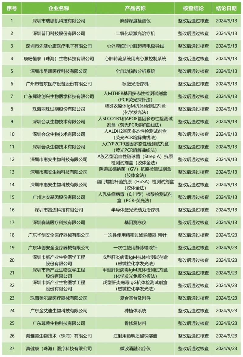 10月17日,廣東省藥監(jiān)局官網公布2024年9月醫(yī)療器械注冊質量管理體系核查結果,包括海雅美生物技術(珠海)有限公司的注射用透明質酸鈉溶液、深圳普門科技股份有限公司的二氧化碳激光治療機、廣州市普東醫(yī)療設備股份有限公司的鈥激光治療機等共計27款產品,核查結論均為“整改后通過核查”。具體明細見下方表格: