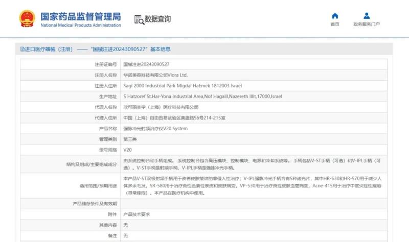 近日,國家藥監(jiān)局發(fā)布公告稱,2024年9月,國家藥監(jiān)局共批準(zhǔn)注冊醫(yī)療器械產(chǎn)品444個。在批準(zhǔn)注冊的產(chǎn)品清單附件中,有一款進(jìn)口第三類醫(yī)療器械引起了我們的注意——強脈沖光射頻治療儀。我們通過檢索附件中公布的注冊證編號發(fā)現(xiàn),該產(chǎn)品的注冊人是以色列華諾美容科技有限公司Viora Ltd.,國內(nèi)代理人則是華東醫(yī)藥的子公司欣可麗美學(xué)(上海)醫(yī)療科技有限公司。