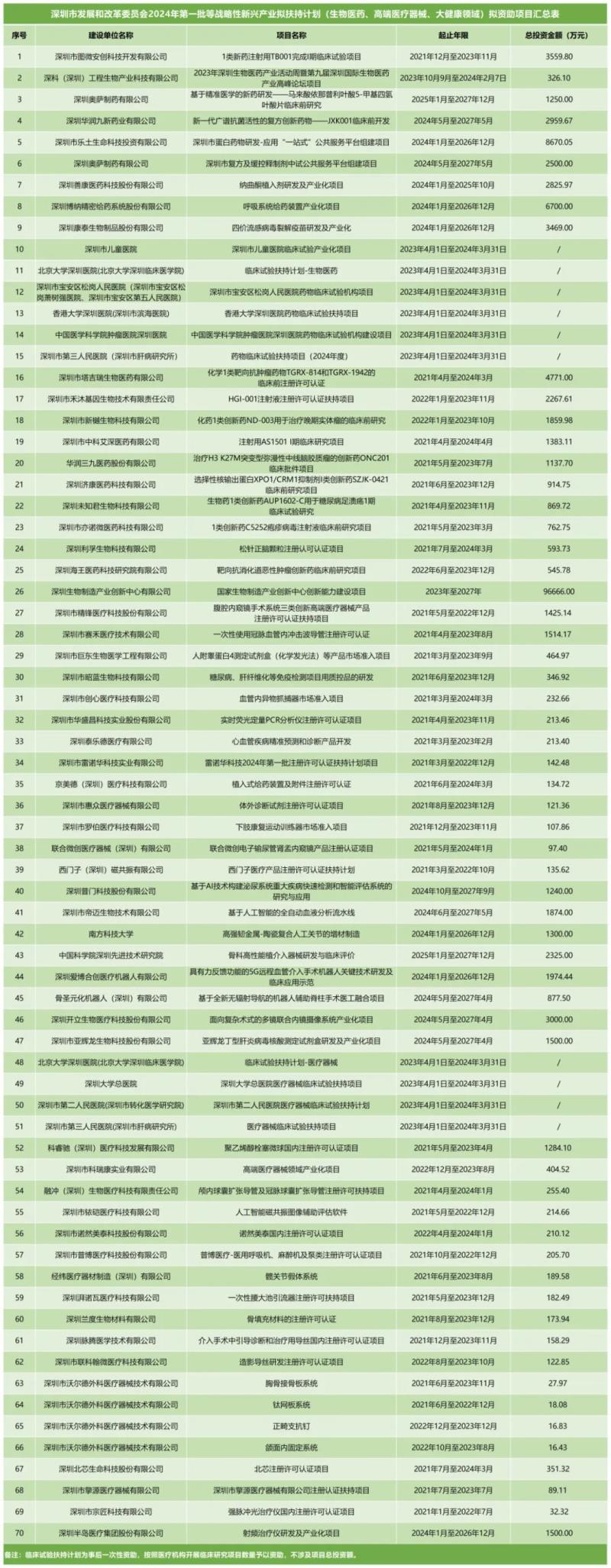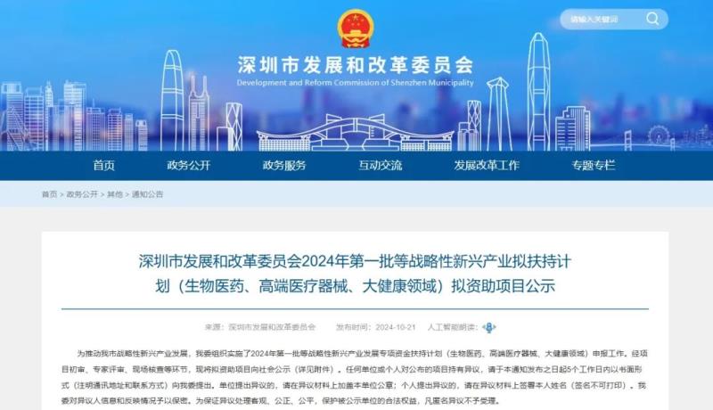 10月21日,深圳市發(fā)展和改革委員會發(fā)布了2024年第一批戰(zhàn)略性新興產(chǎn)業(yè)扶持計劃(生物醫(yī)藥、高端醫(yī)療器械、大健康領(lǐng)域)擬資助項目,公示時間為5個工作日。我們通過查閱附件表格后發(fā)現(xiàn),本批共有70個擬資助項目,包括醫(yī)藥領(lǐng)域臨床前研究、臨床試驗扶持、注冊許可扶持等,總投資金額最高的為96666萬元。深圳發(fā)改委將根據(jù)此前公布的相應(yīng)領(lǐng)域的專項資金項目申報指南,按總投資金額的一定比例對企業(yè)進(jìn)行補(bǔ)貼。