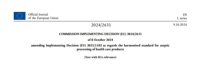近日,歐盟官方日?qǐng)?bào)發(fā)布了EU 2024/2631:關(guān)于修訂(EU) 2021/1182號(hào)實(shí)施決定中有關(guān)保健品無(wú)菌加工的協(xié)調(diào)標(biāo)準(zhǔn)內(nèi)容。該標(biāo)準(zhǔn)的實(shí)施日期為2024年10月9日。