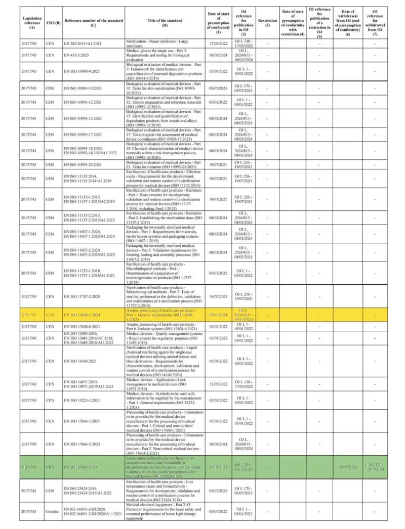 截至目前,歐盟MDR協(xié)調(diào)標(biāo)準(zhǔn)清單共計(jì)26項(xiàng)協(xié)調(diào)標(biāo)準(zhǔn),具體見(jiàn)下方圖片(其中標(biāo)黃的為本次更新標(biāo)準(zhǔn),標(biāo)綠的則為已經(jīng)撤銷(xiāo)的標(biāo)準(zhǔn)):