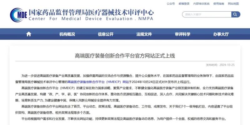 近日,國(guó)家藥監(jiān)局器審中心(以下簡(jiǎn)稱“器審中心”)發(fā)布動(dòng)態(tài)稱,由器審中心管理的高端醫(yī)療裝備創(chuàng)新合作平臺(tái)(HMEICP)網(wǎng)站已于2024年10月24日正式對(duì)外發(fā)布并上線運(yùn)行。