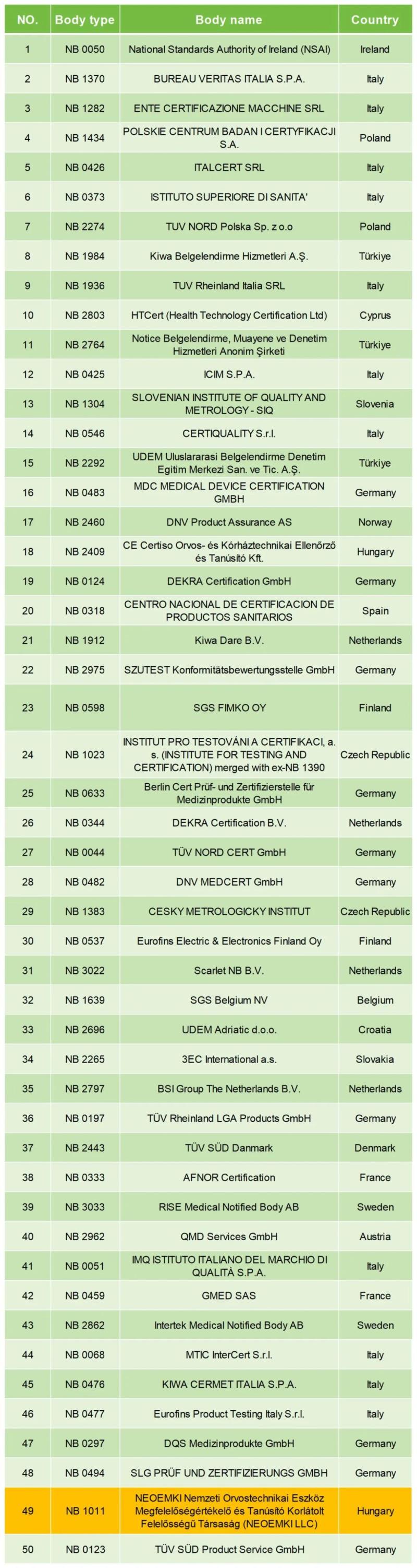 迄今為止,歐盟MDR公告機構(gòu)共有50家,其中意大利的公告機構(gòu)最多(11家),其次是德國(10家),第三則為荷蘭(共4家)。我們將所有歐盟MDR公告機構(gòu)名單匯總如下(標注為黃色的即為本次新增):