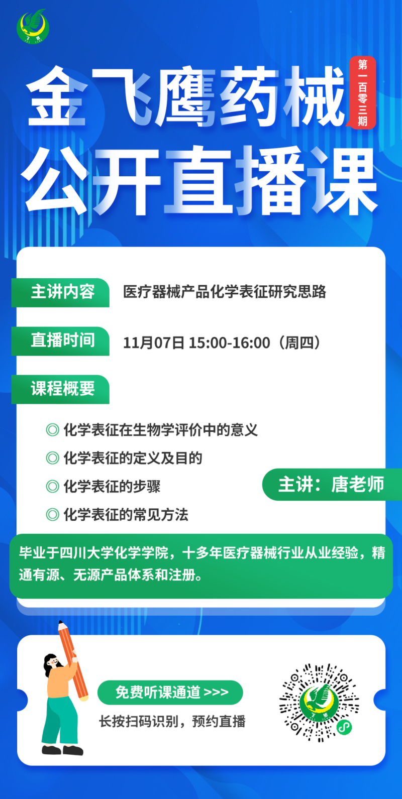 金飛鷹直播培訓(xùn)簡(jiǎn)介 金飛鷹直播培訓(xùn),是每周一次的固定培訓(xùn)欄目,優(yōu)選金飛鷹國(guó)內(nèi)外資深注冊(cè)/項(xiàng)目老師定期為大家講解醫(yī)療器械注冊(cè)相關(guān)知識(shí),解答大家在醫(yī)療器械注冊(cè)過程中的諸多疑問。 此前我們已為大家?guī)硇掳驷t(yī)療器械生物學(xué)評(píng)價(jià)標(biāo)準(zhǔn)、新版醫(yī)療器械風(fēng)險(xiǎn)管理標(biāo)準(zhǔn)、醫(yī)療器械軟件注冊(cè)、新版醫(yī)療器械經(jīng)營(yíng)質(zhì)量管理規(guī)范等共計(jì)102次線上培訓(xùn)課程,有興趣的可點(diǎn)擊視頻號(hào)直播回放進(jìn)行查看~另外大家也一定很關(guān)注接下來的培訓(xùn)主題,相關(guān)培訓(xùn)預(yù)告我們會(huì)陸續(xù)添加至視頻號(hào),請(qǐng)大家持續(xù)關(guān)注哦!