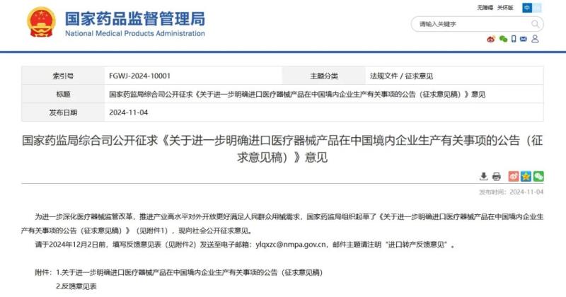 11月4日,國(guó)家藥監(jiān)局發(fā)布《關(guān)于進(jìn)一步明確進(jìn)口醫(yī)療器械產(chǎn)品在中國(guó)境內(nèi)企業(yè)生產(chǎn)有關(guān)事項(xiàng)的公告(征求意見(jiàn)稿)》(以下簡(jiǎn)稱《公告》),并向社會(huì)公開(kāi)征求意見(jiàn)。