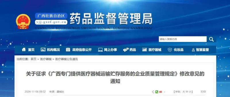 近日,廣西壯族自治區(qū)藥監(jiān)局發(fā)布《廣西專門提供醫(yī)療器械運(yùn)輸貯存服務(wù)的企業(yè)質(zhì)量管理規(guī)定》(以下簡稱《規(guī)定》),并向社會公開征求意見。