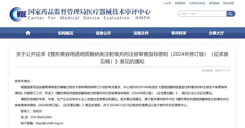 11月12日,國家藥監(jiān)局器審中心發(fā)布《整形美容用透明質酸鈉類注射填充劑注冊審查指導原則(2024年修訂版)(征求意見稿)》(以下簡稱《指導原則》),并向社會公開征求意見。