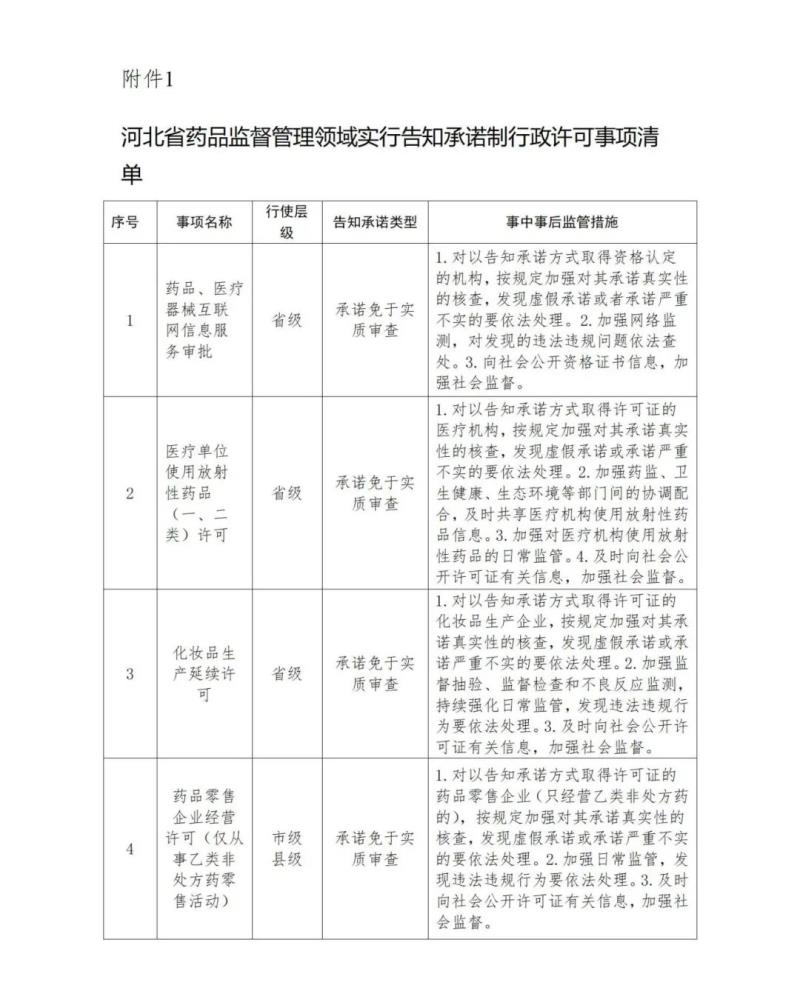 近日,河北省藥監(jiān)局發(fā)布《關(guān)于進(jìn)一步做好行政許可告知承諾制工作的通知》(以下簡(jiǎn)稱《通知》),其中提到,藥品、醫(yī)療器械互聯(lián)網(wǎng)信息服務(wù)審批、醫(yī)療單位使用放射性藥品(一、二類)許可、化妝品生產(chǎn)延續(xù)許可、藥品零售企業(yè)經(jīng)營(yíng)許可(僅從事乙類非處方藥零售活動(dòng))等4項(xiàng)行政許可事項(xiàng)(詳見下方圖片)實(shí)行告知承諾制,相關(guān)監(jiān)管部門需加強(qiáng)審批和監(jiān)管工作。