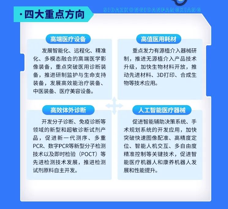 《行動計劃》共提出了四大重點方向、六個重大工程、八大保障措施,按照“融合創(chuàng)新、醫(yī)產(chǎn)協(xié)同、聯(lián)動發(fā)展、開放合作”的基本原則,圍繞產(chǎn)業(yè)規(guī)模、創(chuàng)新效益、企業(yè)實力、產(chǎn)業(yè)生態(tài)四個維度,提出到2026年總體規(guī)模突破500億元、打造專業(yè)化產(chǎn)業(yè)園區(qū)5個以上、創(chuàng)新品種累計突破100個、力爭培育億元級新產(chǎn)品10個以上、新增一批國家級或市級創(chuàng)新載體、支持建設(shè)一批創(chuàng)新醫(yī)療器械示范應用中心、培訓中心、產(chǎn)教融合基地等具體目標,力爭到“十五五”末建成對標世界一流水平的高端創(chuàng)新醫(yī)療器械產(chǎn)業(yè)集群。