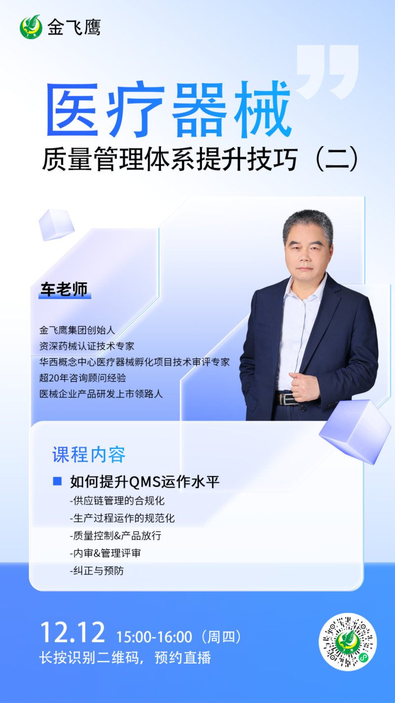 金飛鷹直播培訓(xùn)簡介 金飛鷹直播培訓(xùn),是每周一次的固定培訓(xùn)欄目,優(yōu)選金飛鷹國內(nèi)外資深注冊/項目老師定期為大家講解醫(yī)療器械注冊相關(guān)知識,解答大家在醫(yī)療器械注冊過程中的諸多疑問。 此前我們已為大家?guī)硇掳驷t(yī)療器械生物學(xué)評價標(biāo)準(zhǔn)、新版醫(yī)療器械風(fēng)險管理標(biāo)準(zhǔn)、醫(yī)療器械軟件注冊、新版醫(yī)療器械經(jīng)營質(zhì)量管理規(guī)范等共計106次線上培訓(xùn)課程,有興趣的可點擊視頻號直播回放進(jìn)行查看~另外大家也一定很關(guān)注接下來的培訓(xùn)主題,相關(guān)培訓(xùn)預(yù)告我們會陸續(xù)添加至視頻號,請大家持續(xù)關(guān)注哦!