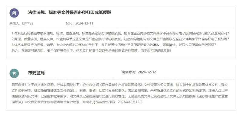 根據(jù)北京市藥監(jiān)局的答復(fù),企業(yè)應(yīng)依據(jù)《醫(yī)療器械生產(chǎn)質(zhì)量管理規(guī)范》文件管理的相關(guān)要求,建立健全的質(zhì)量管理體系文件,建立文件控制程序,確立質(zhì)量管理體系文件的設(shè)計(jì)、制定、審核、批準(zhǔn)和發(fā)放的要求,滿足追溯需要。未對(duì)質(zhì)量體系文件的形式作出明確要求。注冊(cè)人應(yīng)當(dāng)嚴(yán)格按照法規(guī)及文件、記錄控制程序要求,對(duì)文件及記錄的受控形式進(jìn)行有效管理。無(wú)論是紙質(zhì)文件記錄或是電子文件記錄,均應(yīng)按照《醫(yī)療器械生產(chǎn)質(zhì)量管理規(guī)范》中文件記錄相關(guān)控制要求進(jìn)行有效管理。
