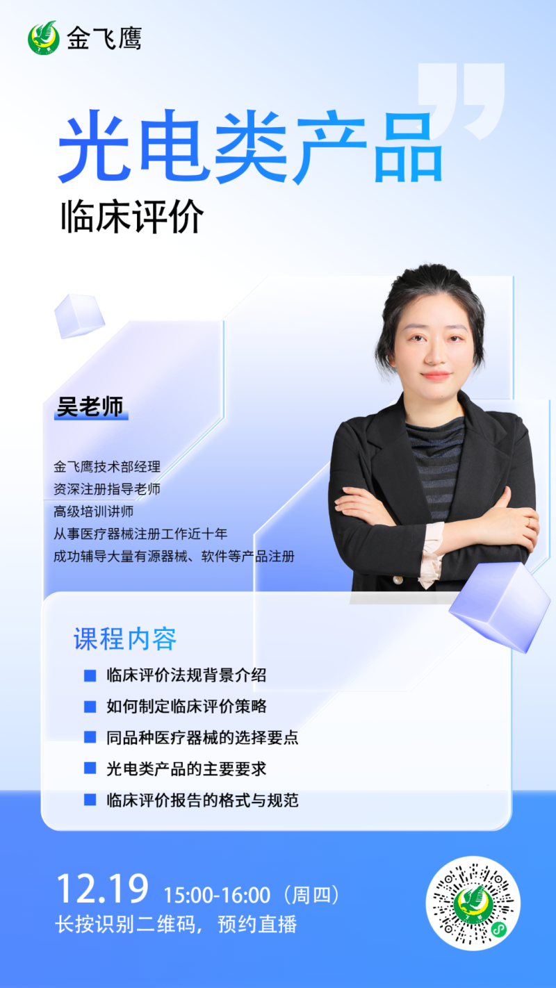 根據(jù)金飛鷹近18年的醫(yī)療器械注冊輔導(dǎo)經(jīng)驗總結(jié),臨床評價資料一直是讓企業(yè)最為頭疼的項目,資料的不完善會直接導(dǎo)致注冊周期的延長。經(jīng)常關(guān)注我們的朋友也許還記得,此前我們跟大家分享過幾期有關(guān)醫(yī)療器械臨床評價的內(nèi)容(點(diǎn)擊視頻號主頁可觀看回放),那么本期培訓(xùn),我們在帶大家一起回顧臨床評價基礎(chǔ)知識的同時,主要偏向于光電類產(chǎn)品的臨床評價,結(jié)合我們輔導(dǎo)過的光電類產(chǎn)品案例進(jìn)行講解,從而給此類企業(yè)臨床評價提供更多實用參考。12月19日下午3點(diǎn),金飛鷹技術(shù)部經(jīng)理、從事醫(yī)療器械注冊工作近十年的吳老師給大家?guī)怼豆怆婎惍a(chǎn)品臨床評價》,培訓(xùn)內(nèi)容包括臨床評價法規(guī)背景介紹、如何制定臨床評價策略、同品種醫(yī)療器械的選擇要點(diǎn)、光電類產(chǎn)品的臨床評價要求、臨床評價報告的格式與規(guī)范,想聽課的朋友記得提前預(yù)約!