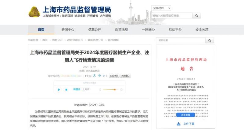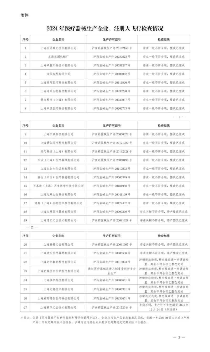 12月19日,上海市藥監(jiān)局發(fā)布《關(guān)于2024年度醫(yī)療器械生產(chǎn)企業(yè)、注冊(cè)人飛行檢查情況的通告》,其中提到,依據(jù)醫(yī)療器械生產(chǎn)質(zhì)量管理規(guī)范及其現(xiàn)場(chǎng)檢查指導(dǎo)原則等,該局組織對(duì)上海市醫(yī)療器械生產(chǎn)企業(yè)開展了飛行檢查,發(fā)現(xiàn)27家企業(yè)存在不同程度問題,其中17家企業(yè)存在一般不符合項(xiàng),4家企業(yè)存在關(guān)鍵不符合項(xiàng),5家企業(yè)涉嫌違法違規(guī),另有一家企業(yè)去向不明。其中有一點(diǎn)值得注意的是,涉嫌違法違規(guī)企業(yè)主要涉及超期提交定期風(fēng)險(xiǎn)評(píng)價(jià)報(bào)告。本次“飛檢”情況具體明細(xì)如下: