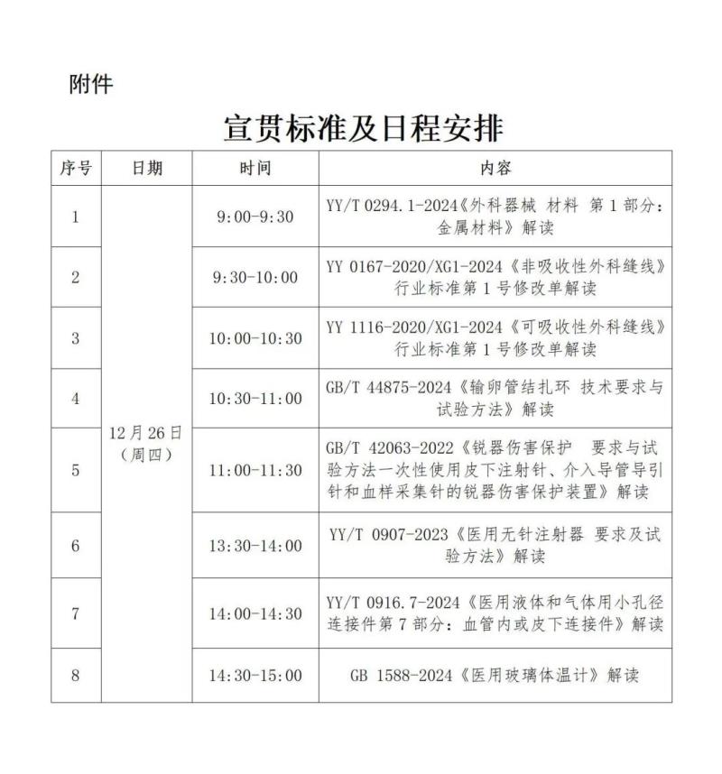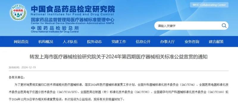 近日,國家藥監(jiān)局醫(yī)療器械標準管理中心轉(zhuǎn)發(fā)了《上海市醫(yī)療器械檢驗研究院關(guān)于2024年第四期醫(yī)療器械相關(guān)標準公益宣貫的通知》,其中提到,全國外科器械標準化技術(shù)委員會(SAC/TC94)、全國醫(yī)用電器標準化技術(shù)委員會醫(yī)用電子儀器分技術(shù)委員會(SAC/TC10/SC5)、全國醫(yī)用注射器(針)標準化技術(shù)委員會(SAC/TC95)、全國避孕與婦產(chǎn)科器械標準化技術(shù)委員會(SAC/TC169)擬于2024年12月26日舉辦相關(guān)標準宣貫培訓(xùn),培訓(xùn)內(nèi)容為YY/T 0907-2023《醫(yī)用無針注射器要求及驗方法》等8項標準解讀,具體如下: