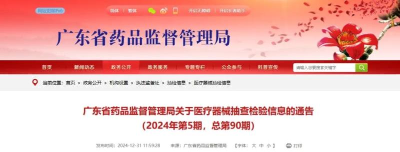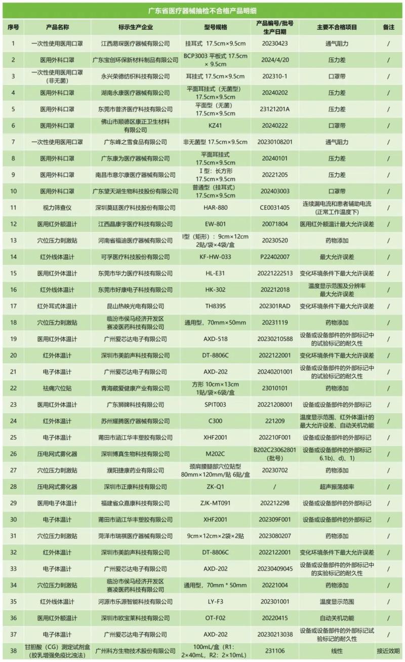 12月31日,廣東藥監(jiān)局發(fā)布《關于醫(yī)療器械抽查檢驗信息的通告(2024年第5期,總第90期)》,我們通過查看通告中的附件發(fā)現(xiàn),本次共抽查檢驗了996批次產品,其中有38批次不符合規(guī)定,包括醫(yī)用外科口罩、視力篩查儀、穴位壓力刺激貼、醫(yī)用紅外額溫計等產品,不符合規(guī)定產品具體明細如下: