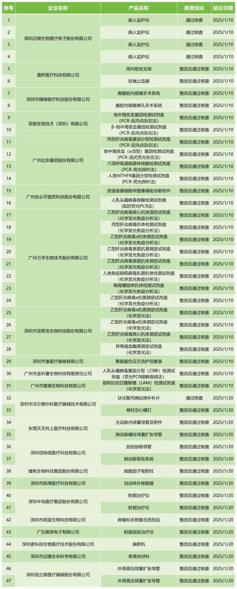 2月12日,廣東省藥監(jiān)局官網(wǎng)公布2025年1月醫(yī)療器械注冊質(zhì)量管理體系核查結(jié)果,包括深圳邁瑞生物醫(yī)療電子股份有限公司的四款病人監(jiān)護儀、深圳半島醫(yī)療集團股份有限公司的兩款射頻治療儀、廣東雅思電子有限公司的射頻皮膚治療儀等共計47款產(chǎn)品,其中有五款產(chǎn)品核查結(jié)論為“通過核查”,其余均為“整改后通過核查”。具體明細見下方表格: