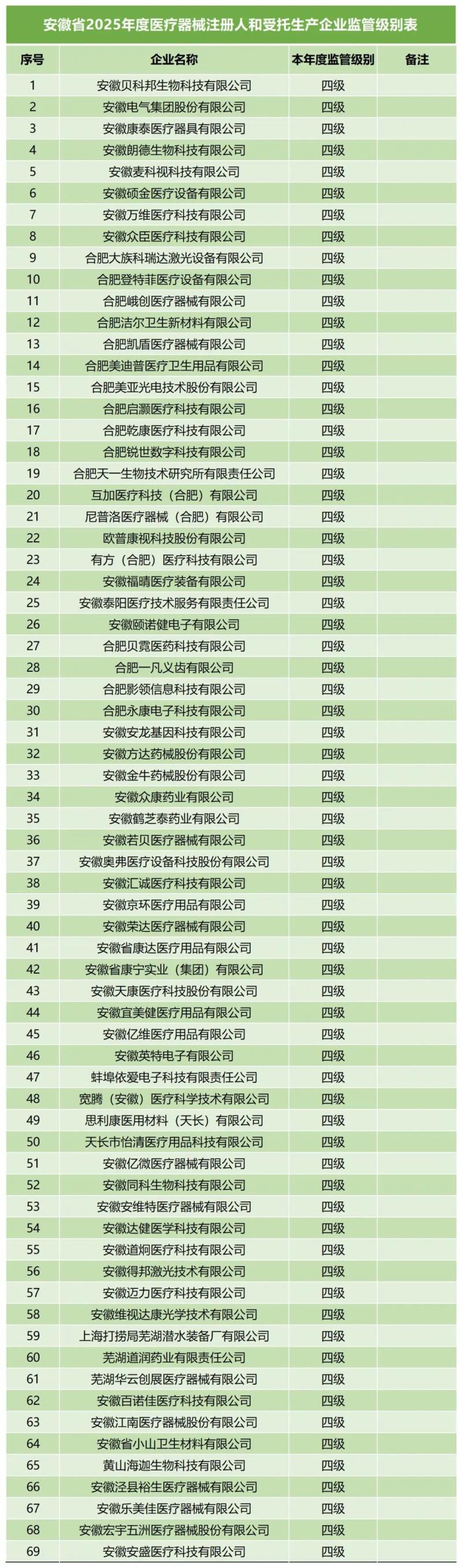 日前,安徽省藥監(jiān)局公布了2025年度醫(yī)療器械注冊人和受托生產(chǎn)企業(yè)監(jiān)管級別企業(yè)名單,我們通過查看附件發(fā)現(xiàn),共有536家企業(yè),其中有69家企業(yè)為四級監(jiān)管,52家企業(yè)為三級監(jiān)管,其余415家企業(yè)為二級監(jiān)管。我們將四級監(jiān)管企業(yè)名單摘錄如下:
