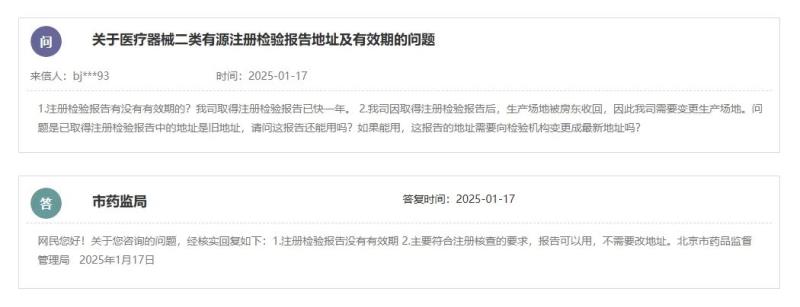根據(jù)北京市藥監(jiān)局的答復(fù),1、注冊檢驗報告沒有有效期;2、只要符合注冊核查的要求,檢驗報告可以用,不需要改地址。