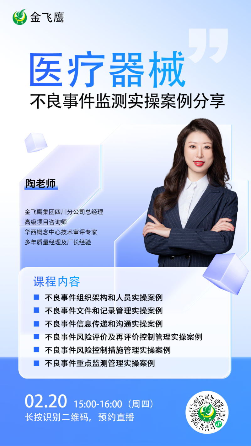 金飛鷹直播培訓(xùn)簡(jiǎn)介 金飛鷹直播培訓(xùn),是每周一次的固定培訓(xùn)欄目,優(yōu)選金飛鷹國(guó)內(nèi)外資深注冊(cè)/項(xiàng)目老師定期為大家講解醫(yī)療器械注冊(cè)相關(guān)知識(shí),解答大家在醫(yī)療器械注冊(cè)過(guò)程中的諸多疑問(wèn)。 此前我們已為大家?guī)?lái)新版醫(yī)療器械生物學(xué)評(píng)價(jià)標(biāo)準(zhǔn)、新版醫(yī)療器械風(fēng)險(xiǎn)管理標(biāo)準(zhǔn)、醫(yī)療器械軟件注冊(cè)、醫(yī)療器械質(zhì)量管理體系提升技巧等共計(jì)111次線(xiàn)上培訓(xùn)課程,有興趣的可點(diǎn)擊視頻號(hào)直播回放進(jìn)行查看~另外大家也一定很關(guān)注接下來(lái)的培訓(xùn)主題,相關(guān)培訓(xùn)預(yù)告我們會(huì)陸續(xù)添加至視頻號(hào),請(qǐng)大家持續(xù)關(guān)注哦!
