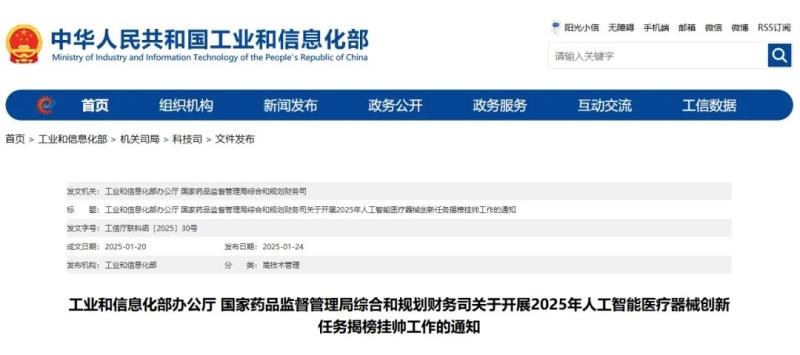 日前,工業(yè)和信息化部辦公廳、國(guó)家藥品監(jiān)督管理局綜合和規(guī)劃財(cái)務(wù)司聯(lián)合印發(fā)《關(guān)于開展2025年人工智能醫(yī)療器械創(chuàng)新任務(wù)揭榜掛帥工作的通知》(工信廳聯(lián)科函〔2025〕30號(hào))(以下簡(jiǎn)稱《通知》),以推動(dòng)人工智能技術(shù)與醫(yī)療器械深度融合發(fā)展,更好地服務(wù)和保障人民群眾生命健康,加快形成新質(zhì)生產(chǎn)力。