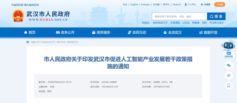 近日,武漢市人民政府發(fā)布《武漢市促進(jìn)人工智能產(chǎn)業(yè)發(fā)展若干政策措施》(以下簡稱《措施》),以搶抓人工智能發(fā)展機遇,加快建設(shè)武漢國家人工智能創(chuàng)新應(yīng)用先導(dǎo)區(qū),打造國內(nèi)一流的人工智能創(chuàng)新集聚區(qū)和產(chǎn)業(yè)高地。