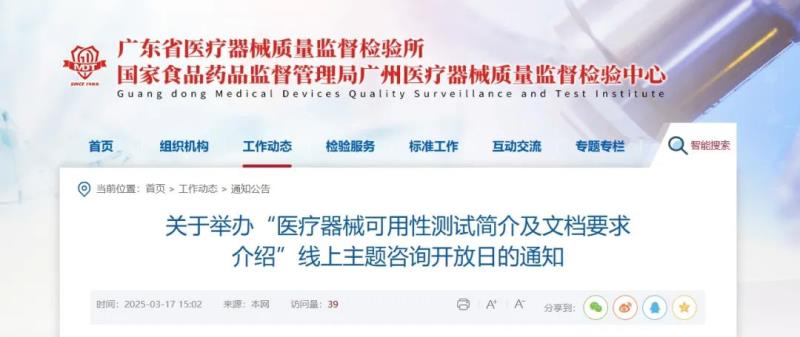 3月17日,廣東省醫(yī)療器械質(zhì)量監(jiān)督檢驗所官網(wǎng)發(fā)布通知稱,定于3月21日(周五)舉辦“醫(yī)療器械可用性測試簡介及文檔要求介紹”線上主題咨詢開放日活動,具體時間及參會方式如下: